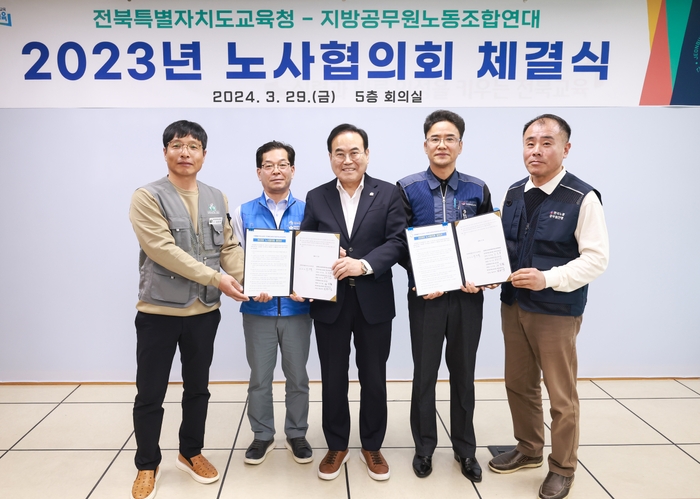 전북특별자치도교육청(교육감 서거석, 이하 전북교육청)은 29일 도교육청 5층 회의실에서 지방공무원 노동조합연대와 ‘2023년 노사협의회 체결식’을 개최했다.