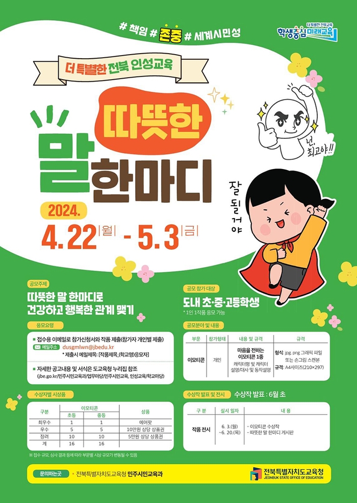 전북특별자치도교육청(교육감 서거석)이 학생들의 바른 인성 함양을 위해 '따뜻한 말 한마디' 공모전을 개최한다고 22일 밝혔다.