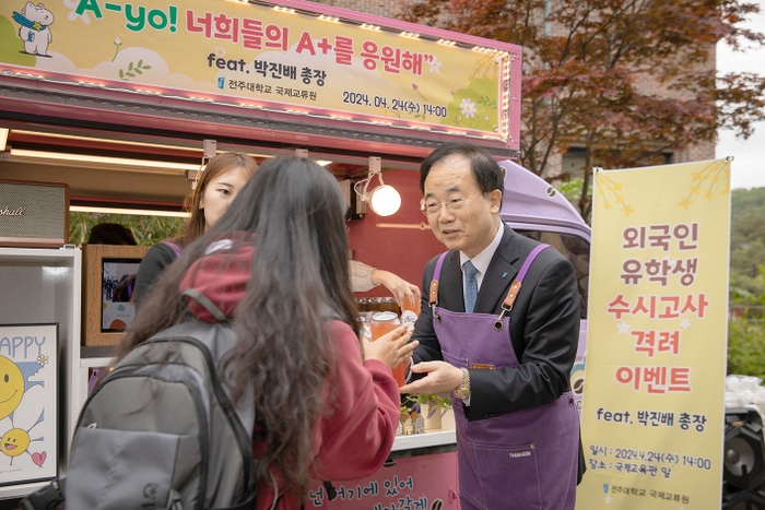 전주대는 지난 24일 중간고사 기간에 관심과 응원이 필요한 외국인 유학생 200여 명에게 간식 나눔 이벤트를 펼쳤다.