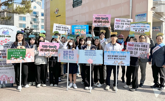 서곡중 교권존중 교육주간 행사의 일환으로 펼쳐진 이날 캠페인은 최근 학교의 무분별한 아동학대 신고와 불법 녹음 등으로 교원의 사기가 많이 떨어진 교육 현장에 교육력을 회복하기 위해 기획됐다.