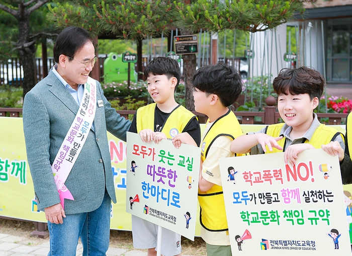전북특별자치도교육청(교육감 서거석)은 학교폭력을 예방하고 안전하고 평화로운 학교문화 조성을 위해 24일 전주화정초등학교에서 ‘모두의 학교를 위한 학교문화 책임규약 실천 등굣길 캠페인’을 펼쳤다.