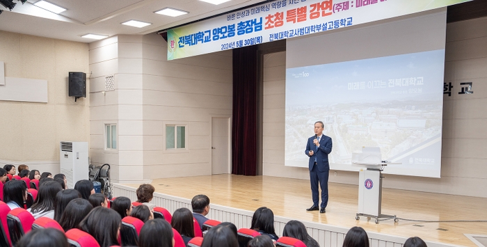 전북대학교 양오봉 총장이 올해도 일선 고교를 찾아 우수인재 유치를 위한 ‘전북대 세일즈’에 나섰다. 양 총장은 5월 30일 오후 3시 30분 전북대 사대부고를 찾아 ‘나의 꿈, 미래, 그리고 전북대학교’를 주제로 한 특강을 통해 고교생들에게 꿈에 대한 중요성과 전북대의 우수성 및 미래 혁신방안, 학생 지원 방향 등을 밝혀 큰 호응을 얻었다.
