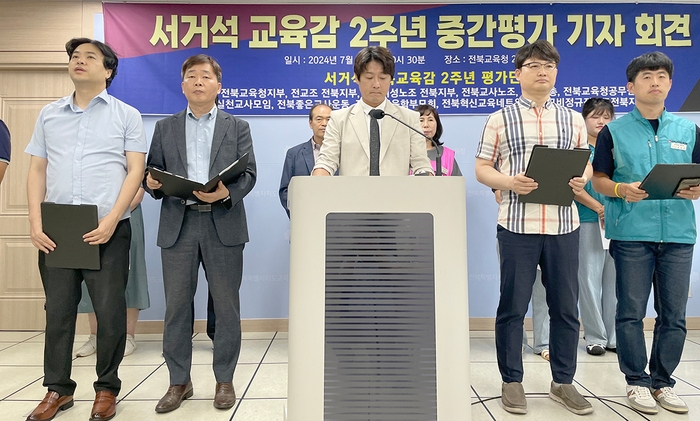 전북 11개 교원단체는 3일 전북교육청 브리핑실에서 각 단체들이 참여한 가운데 기자회견을 열어 서거석 교육감 2주년 중간 평가 설문 조사 결과를 발표했다.