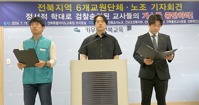 6개 교원단체는 11일 전북교육청 브리핑실에서 기자회견을 갖고 "경찰은 서거석 교육감 '아동학대가 아니다'는 의견서를 반영해 아동학대 여부를 판단하고, 검찰은 억울하게 정서적 학대 혐의로 송치된 교사들의 기소를 중단하라"고 주장했다.